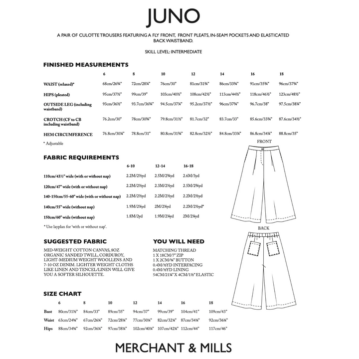 The Juno Culottes Trousers Sewing Pattern UK 6-18 - Merchant & Mills